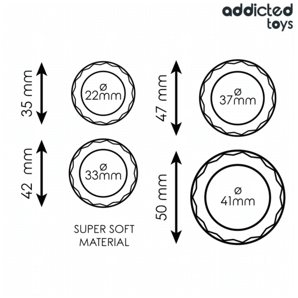 El set incluye cuatro anillos de diferentes tamaños —22 mm, 33 mm, 37 mm y 41 mm— para adaptarse a las distintas necesidades y preferencias de cada usuario. Gracias a su diseño ergonómico y texturizado, cada anillo proporciona un ajuste firme y seguro, intensificando la estimulación tanto para quien los usa como para su pareja.