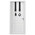 Dos tubos de acrílico unidos a los extremos de las correas de nylon resistentes pueden colocarse sobre la parte superior de una puerta abierta para asegurar que su compañero esté sujeto con seguridad una vez que la puerta esté cerrada y bloqueada.