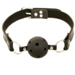 Pelota de goma en color NEGRA diseñada con productos no tóxicos, con agujeros de respiración para la comodidad del sumiso.