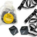 CONTENIDO:2 Ataduras Bondage Negras, 2 Dados (Acción/Cuerpo), Bolsa Organza