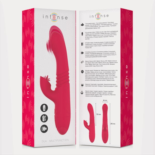El vibrador multifunción DUA de la marca INTENSE es un innovador juguete sexual diseñado para ofrecer una experiencia de placer sin igual. Con su llamativo color rojo y una serie de características avanzadas, este vibrador está diseñado para satisfacer tus deseos más profundos. Aquí tienes una lista de sus características clave: