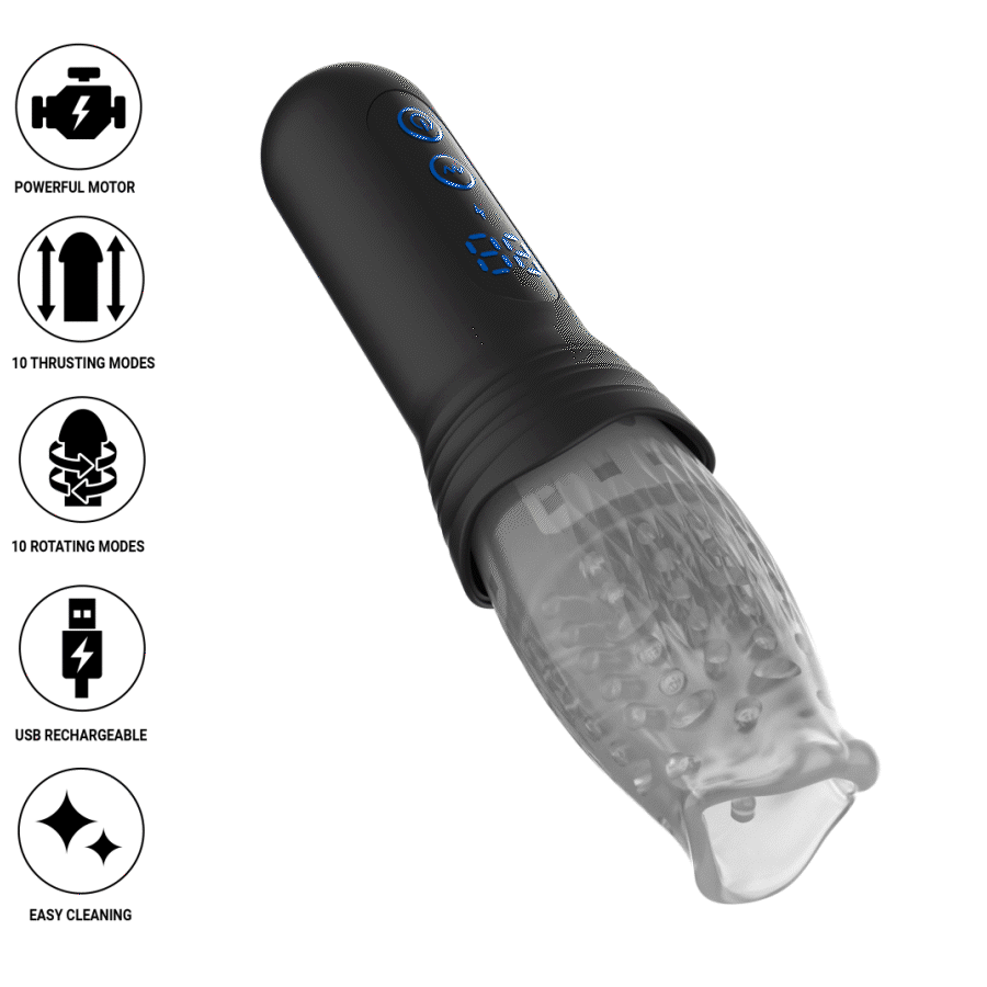 Equipado con 2 potentes motores, ofrece 9 funciones de thrusting y rotación 360º que trabajan de forma fluida y dinámica. Este sistema permite combinar movimientos hacia ambos lados, arriba y abajo, creando una estimulación profunda y variada. Además, incorpora 9 modos de vibración que pueden utilizarse de manera independiente o combinada para adaptar la experiencia a cada momento.