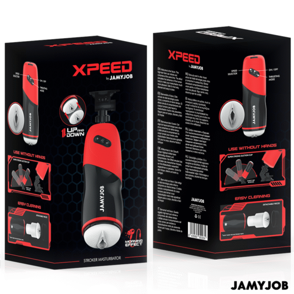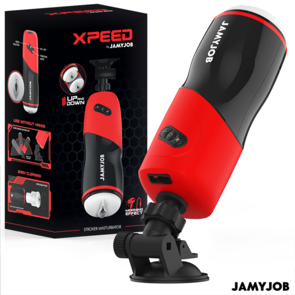El masturbador automático para hombre XPEED de la marca JAMYJOB es un dispositivo innovador y elegante, diseñado para proporcionar una experiencia estimulante y placentera de alta calidad. Con un diseño en color negro y rojo, este masturbador combina estética y funcionalidad en un solo producto.