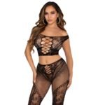 LEG AVENUE – CROP TOP Y LEGGING DE REJILLA CON HOMBROS DESCUBIERTOS NEGRO