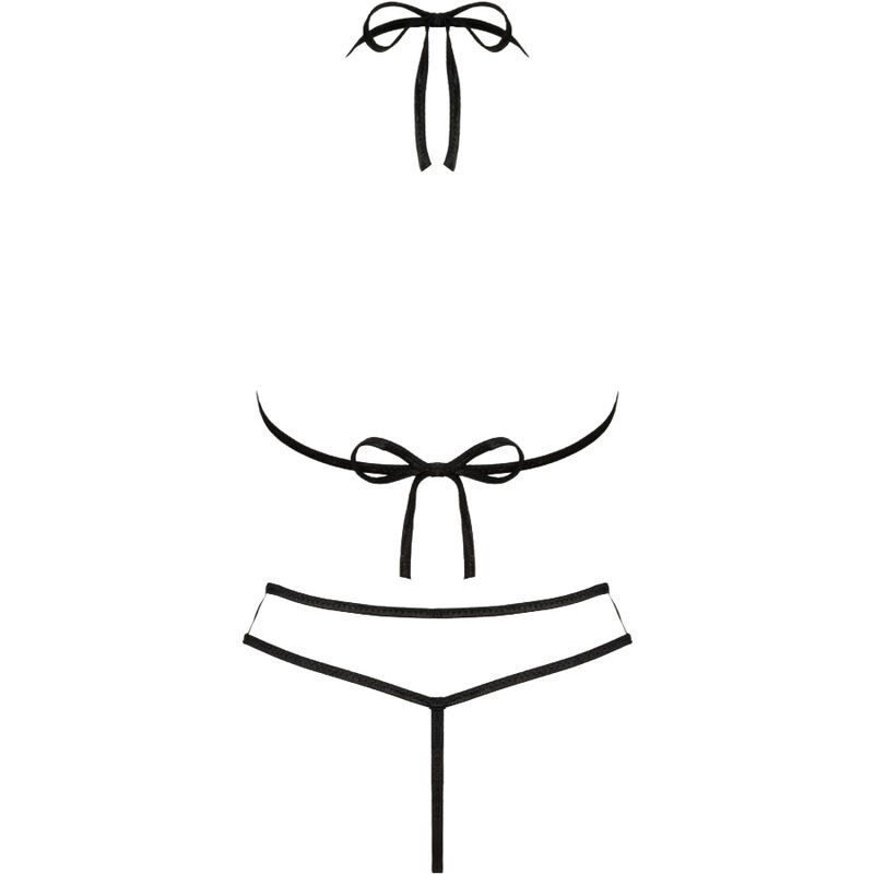 El inusual y picante conjunto de Jimena se compone de sujetador y tanga a juego. Las cintas negras acentúan además su carácter seductor.