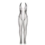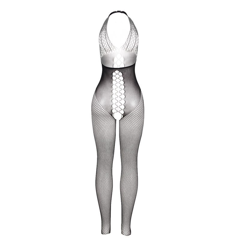 - Estilo: Bodystocking negro con espalda abierta y detalles entrecruzados.