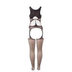 - Estilo: Bodystocking de rejilla negro con diseño crotchless, con pecho y hombros descubiertos.