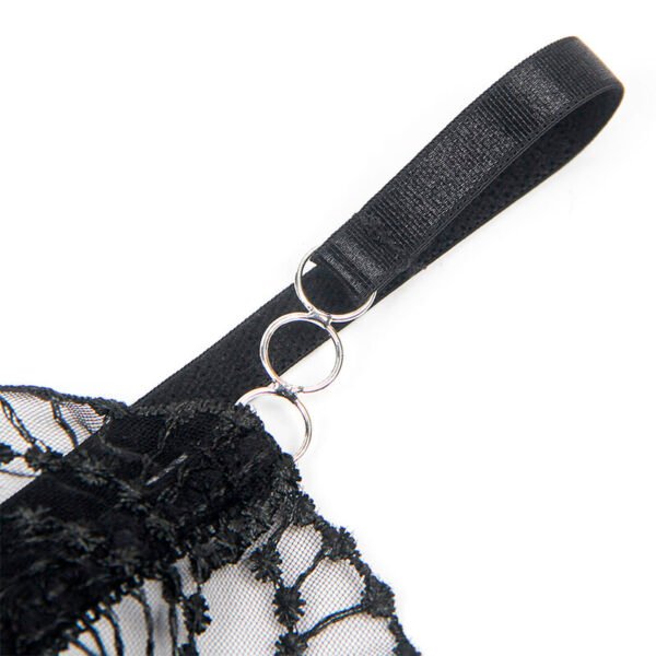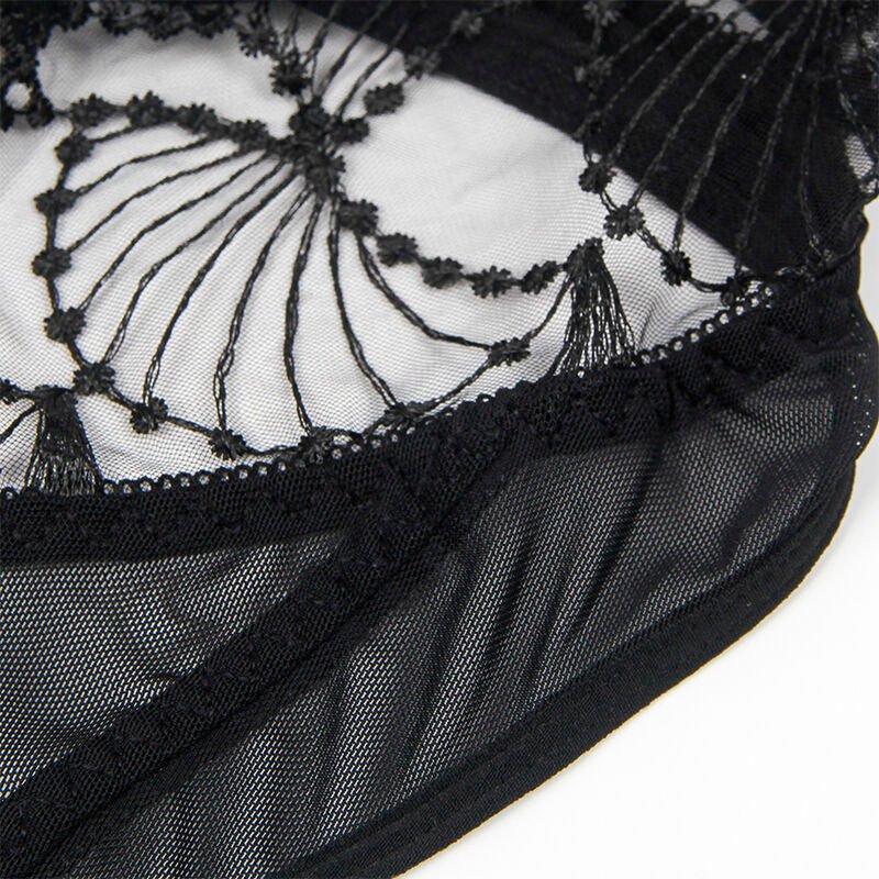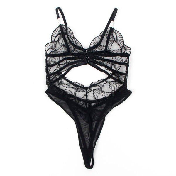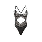 El diseño incorpora detalles de encaje transparente que aportan un toque de delicadeza y refinamiento, mientras que los cortes estratégicos hollow cut realzan la silueta, dejando entrever la piel de forma sutil y seductora. La combinación del encaje con el color negro, clásico y atemporal, añade un aire de misterio y sofisticación que no pasará desapercibido.