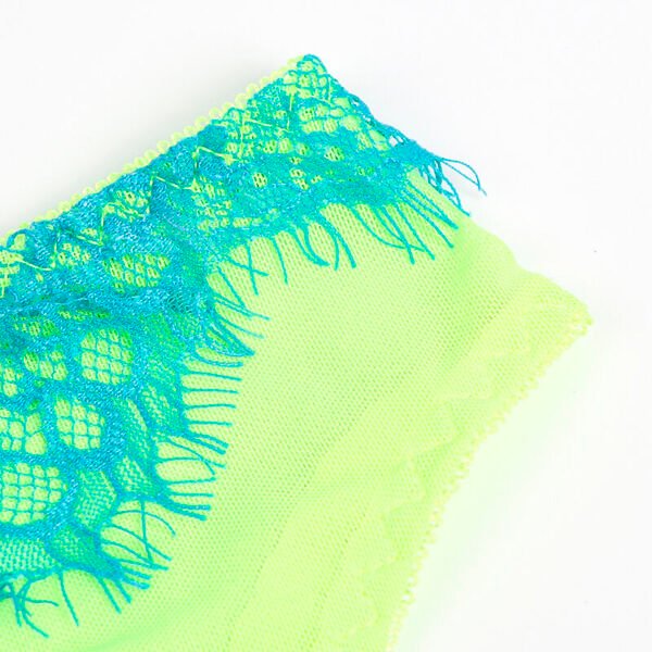 El encaje de pestañas, conocido por su aspecto refinado y romántico, añade un toque femenino y etéreo al conjunto. Su color verde, sofisticado y poco convencional, aporta frescura y modernidad, haciéndolo perfecto para destacar en cualquier ocasión especial o para disfrutar de momentos íntimos.