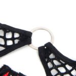 Fabricado con una mezcla de 95% poliéster y 5% elastano/spandex, este conjunto ofrece una textura suave, flexible y cómoda que abraza perfectamente tu cuerpo. El sujetador cuenta con un diseño con cremallera frontal, que no solo añade un detalle práctico y moderno, sino que también aporta un toque provocador. Los paneles de malla estratégicamente ubicados permiten jugar con transparencias, insinuando sin revelar demasiado, mientras que el acabado en cuero sintético brillante le da un aire lujoso y atrevido.