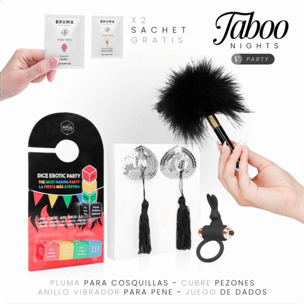 TABOO NIGHTS – 5: PARTY es un pack pensado para romper la rutina y convertir cualquier encuentro en una experiencia divertida, provocadora y llena de complicidad. Combina juego, estimulación y placer compartido, ideal para parejas que buscan un ambiente desenfadado y atrevido.
