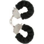 Fabulosas espoesas de muñeca de dos piezas unidas con una cadena de acero cromado, recubiertas con un suave peluche alrededor de los puños de color NEGRO