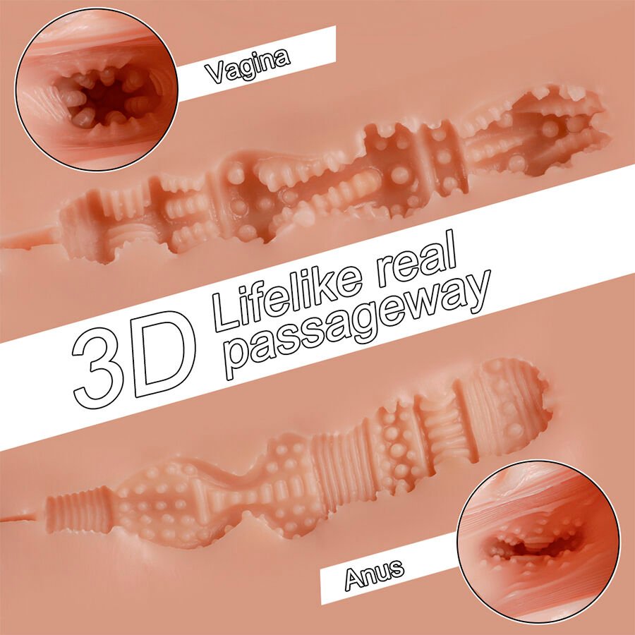 • Vagina: Diseñada con una entrada estrecha y un túnel interno texturizado con estrías y nódulos estratégicos que imitan la sensación de penetración real.